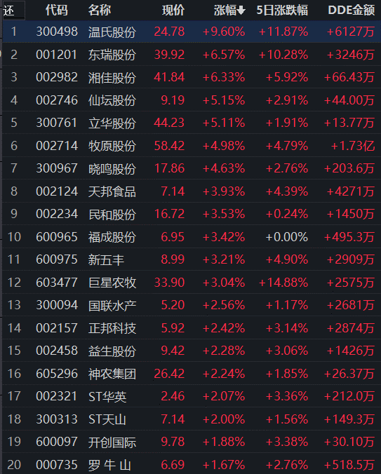 從漲幅居首的養(yǎng)殖業(yè)看,截至8月19日11:30,行業(yè)交易中的25只個股有24只上漲。從資金流向看,養(yǎng)殖業(yè)今天上午大單資金凈流入額達4.51億元,居行業(yè)第4位。