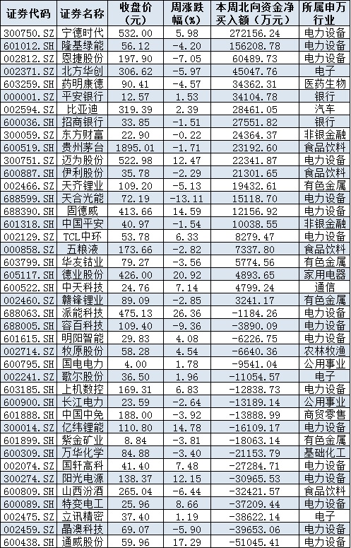 資金方面,北向資金本周累計(jì)凈買(mǎi)入金額達(dá)59.26億元。從前十大成交活躍股來(lái)看,本周,寧德時(shí)代、隆基綠能等2只個(gè)股,北向資金凈買(mǎi)入金額均超10億元。另外,通威股份、晶澳科技、立訊精密、特變電工、山西汾酒、陽(yáng)光電源等個(gè)股遭北向資金凈賣(mài)出金額均超3億元。
