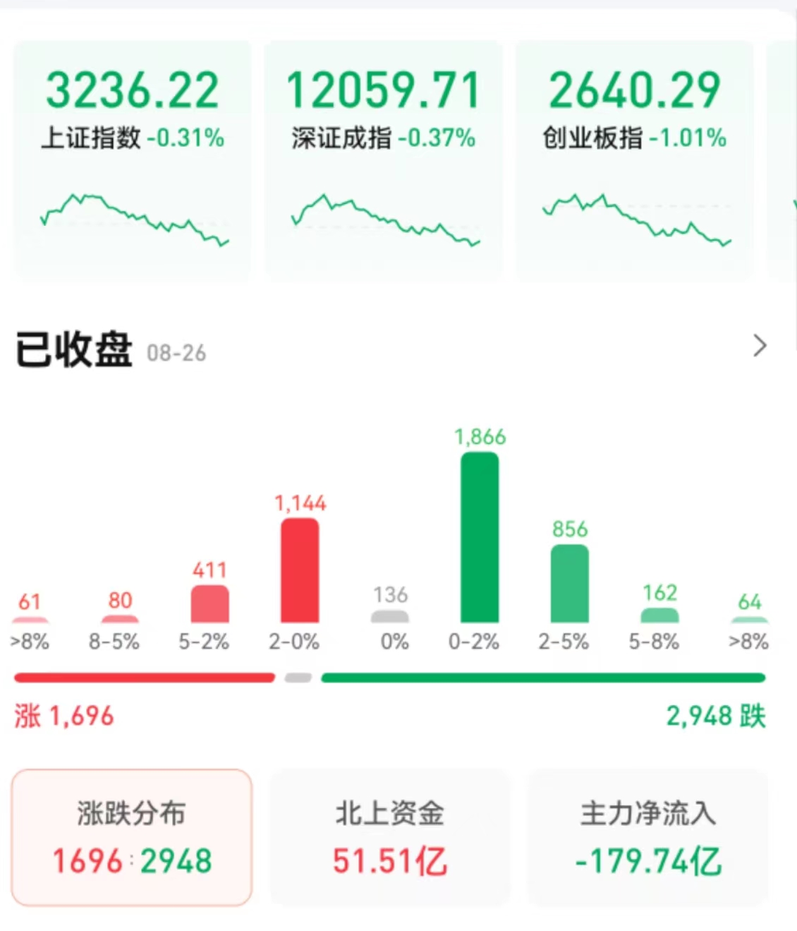 8月26日,A股三大指數(shù)集體收跌,截至收盤,上證指數(shù)跌0.31%報3236.22點,深證成指跌0.37%報12059.71點,創(chuàng)業(yè)板指跌1.01%報2640.29點;兩市合計成交9292億元,北向資金凈買入51.51億元。總體來看,A股個股跌多漲少?;仡櫛局苋笾笖?shù)的走勢來看,上證指數(shù)期間累計跌0.67%,深證成指期間累計跌2.42%,創(chuàng)業(yè)板指期間累計跌3.44%。