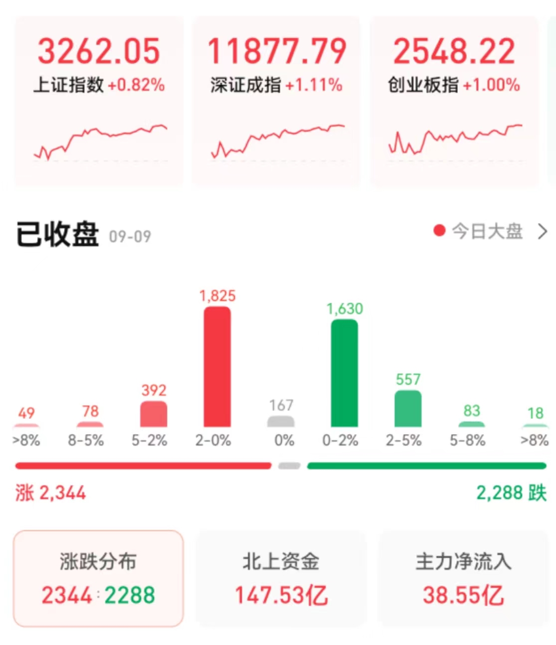 9月9日,A股三大指數(shù)震蕩反彈,集體收漲。截至收盤(pán),上證指數(shù)漲0.82%報(bào)3262.05點(diǎn),深證成指漲1.11%報(bào)11877.79點(diǎn),創(chuàng)業(yè)板指漲1%報(bào)2548.22點(diǎn);兩市合計(jì)成交7796億元,北向資金凈買(mǎi)入147.53億元??傮w來(lái)看,A股個(gè)股漲多跌少?;仡櫛局苋笾笖?shù)的走勢(shì)來(lái)看,上證指數(shù)期間累計(jì)漲2.37%,深證成指期間累計(jì)漲1.5%,創(chuàng)業(yè)板指期間累計(jì)漲0.60%。