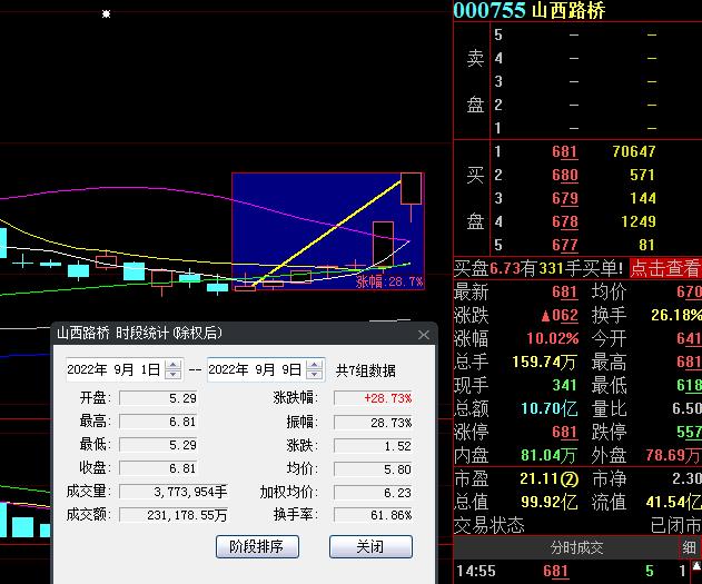 9月9日,熱門(mén)股山西路橋再度漲停,截至收盤(pán),報(bào)6.81元,實(shí)現(xiàn)2連板,7連漲,7個(gè)交易日累計(jì)漲幅達(dá)28.73%。
