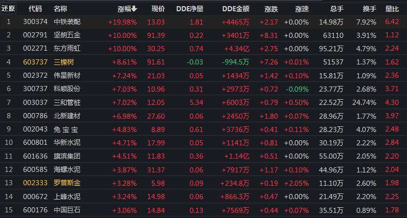 9月9日,建筑材料行業(yè)漲幅居首,達(dá)3.60%。其中,堅(jiān)朗五金、東方雨虹、中鐵裝配等3只概念股集體漲停。
