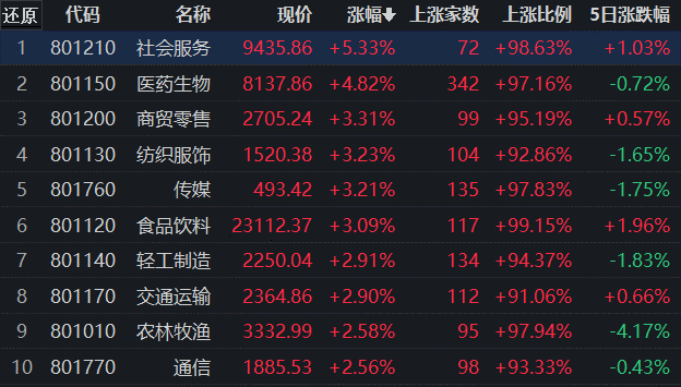 申萬一級行業(yè)方面,31類行業(yè)中有29類上漲,占比93.55%,其中,社會服務(wù)行業(yè)漲幅居前,達5.33%,醫(yī)藥生物和商貿(mào)零售分別以4.82%和3.31%排名第二與第三位;下跌方面,煤炭和石油石化等兩類行業(yè)下跌,跌幅均為0.37%。