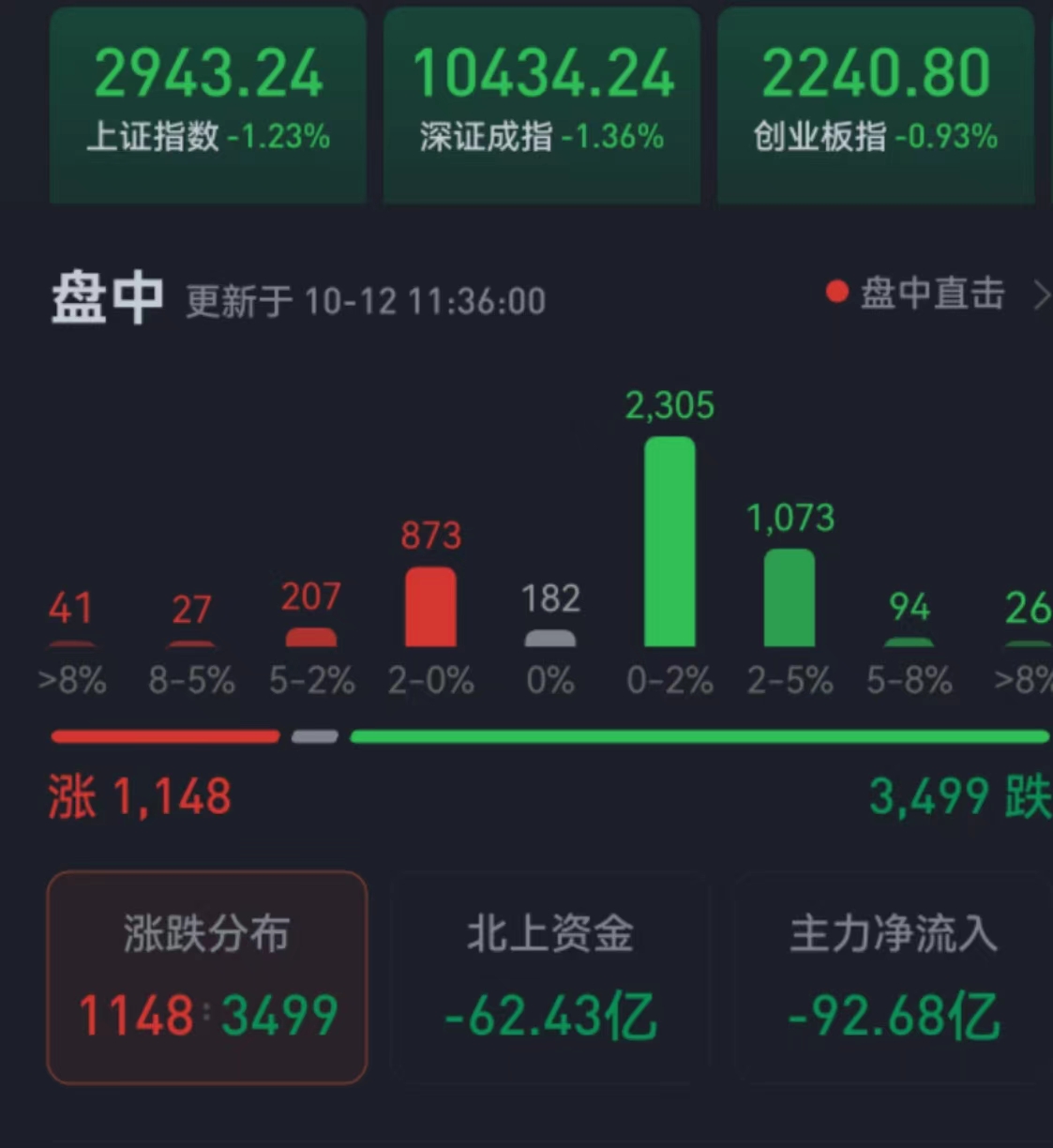 周三(10月12日),三大股指震蕩回落,全線飄綠。截至上午收盤,上證指數(shù)跌幅達(dá)1.23%,報2943.24點;深證成指和創(chuàng)業(yè)板指跌幅分別為1.36%和0.93%;滬深兩市合計成交額3480.7億元,總體來看,兩市個股跌多漲少。