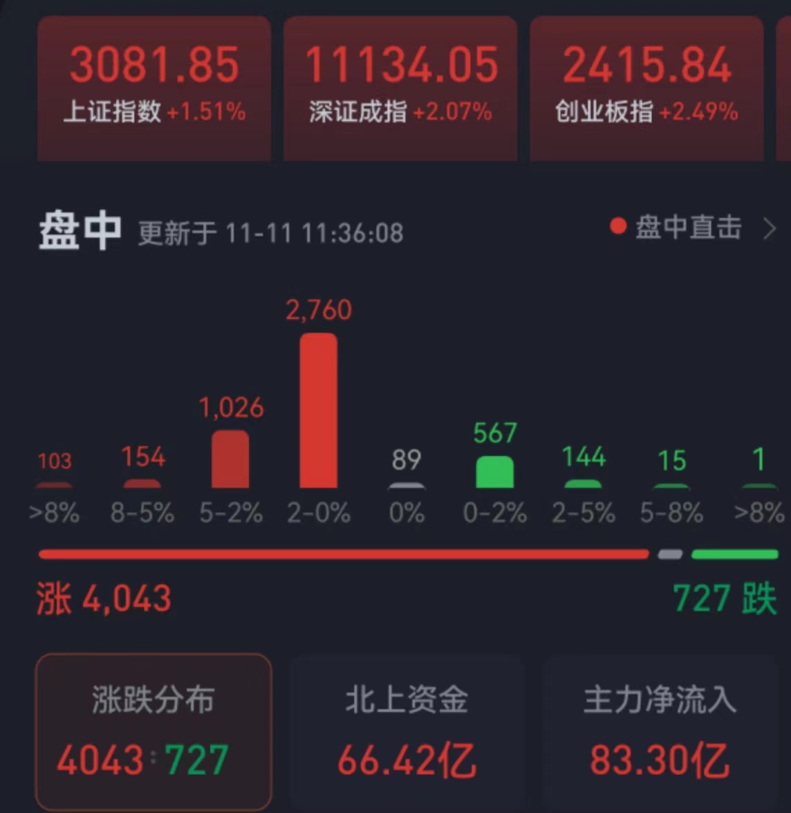 美國10月份CPI數(shù)據(jù)顯著回落,引爆全球資本市場(chǎng)。周五早盤,A股市場(chǎng)受此消息提振,三大股指大幅高開,上證指數(shù)盤中一度漲逾2%突破3100點(diǎn)。截至上午收盤,上證指數(shù)漲幅達(dá)1.51%,報(bào)3081.85點(diǎn);深證成指和創(chuàng)業(yè)板指漲幅分別為2.07%和2.49%;滬深兩市合計(jì)成交額7001.1億元,兩市上漲個(gè)股超4000只。