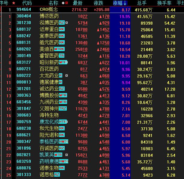 具體看,截至11月11日上午收盤,CRO概念板塊大幅飆升,漲幅居首,達(dá)8.17%。其中,博濟(jì)醫(yī)藥、昭衍新藥、百花醫(yī)藥、太龍藥業(yè)、德展健康等概念股聯(lián)袂漲停。