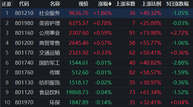 31類申萬一級(jí)行業(yè)中,有5類上漲,其中,社會(huì)服務(wù)漲幅達(dá)1.86%,居首,美容護(hù)理和公用事業(yè)緊隨其后;下跌方面,銀行跌幅居前,下跌1.85%。
