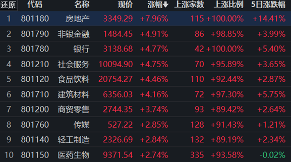 31類申萬一級行業(yè)中,有30類上漲,其中,房地產(chǎn)漲幅達7.96%,居首,非銀金融和銀行緊隨其后;下跌方面,僅公用事業(yè)下跌,跌幅0.49%。