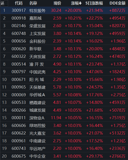 11月29日,申萬一級行業(yè)中房地產(chǎn)行業(yè)領(lǐng)漲,漲幅達7.96%,獲得40.15億元大單資金的凈流入,居資金流入行業(yè)第4位。行業(yè)中115只交易中的個股,全線上漲,其中,82只個股漲幅超5%。
