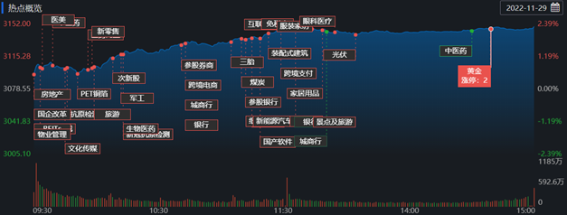 截至11月29日收盤,上證指數(shù)漲2.31%,收報3149.75點,深證成指漲2.40%,收報11089.01點,創(chuàng)業(yè)板指漲1.78%,收報2339.79點;滬深兩市合計成交額9681.2億元,較前一交易日增長27.65%;北向資金凈買入98.06億元;總體來看,A股中上漲個股為4193只,下跌個股740只。