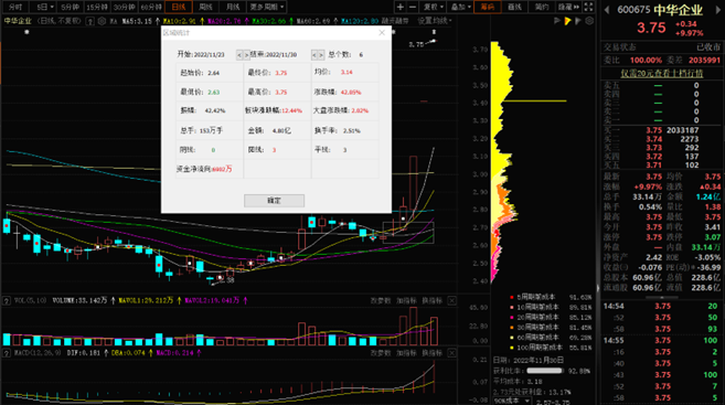 11月30日,中華企業(yè)以3.75元封漲停板報(bào)收,漲幅達(dá)9.97%。該股自11月23日以來(lái),截至11月30日已連續(xù)6個(gè)交易日上漲,累計(jì)漲幅達(dá)42.05%,該股最近3個(gè)交易日均以漲停價(jià)報(bào)收。該股最新A股總市值達(dá)228.6億元,A股流通市值228.6億元。