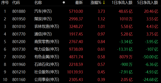 31類申萬(wàn)一級(jí)行業(yè)中,有16類上漲,其中,汽車漲幅達(dá)3.73%,居首,煤炭和農(nóng)林牧漁緊隨其后,漲幅均超1%;下跌方面,建筑材料居首,跌幅達(dá)1.76%,房地產(chǎn)跌幅也超1%。