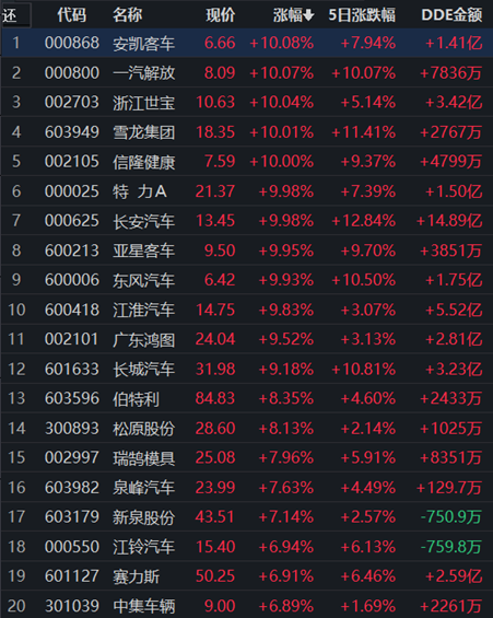 11月30日,申萬(wàn)一級(jí)行業(yè)中汽車行業(yè)領(lǐng)漲,漲幅達(dá)3.73%,獲得48.65億元大單資金的凈流入,居資金流入行業(yè)第1位。行業(yè)中238只交易中的個(gè)股,有217只上漲,其中,39只個(gè)股漲幅超5%。