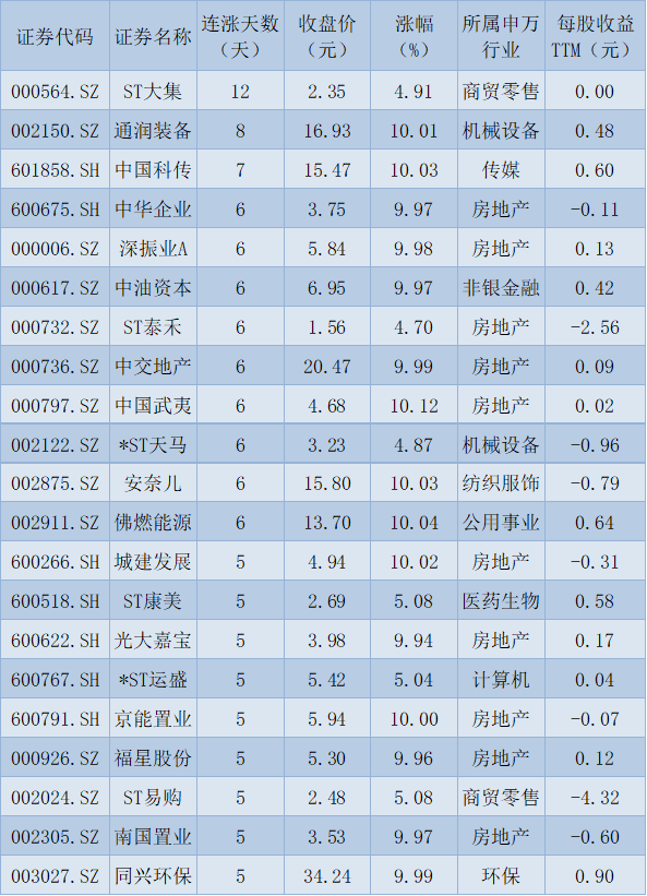 表:連續(xù)上漲5天且今日收盤漲停股一覽