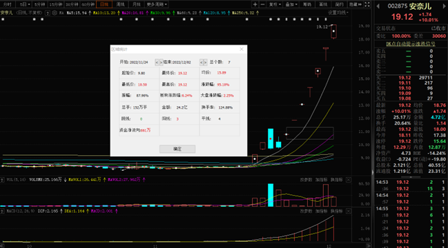 12月2日,安奈兒以19.12元封漲停板報(bào)收,漲幅達(dá)10.01%。該股自11月24日以來,截至12月2日已連續(xù)7個(gè)交易日均以漲停價(jià)報(bào)收,累計(jì)漲幅達(dá)95.10%。該股最新A股總市值達(dá)40.55億元,A股流通市值23.31億元。