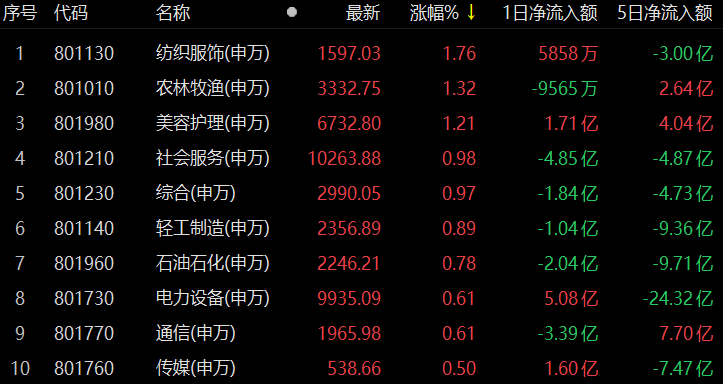 31類申萬一級(jí)行業(yè)中,有17類上漲,其中,紡織服飾漲幅達(dá)1.76%,居首,農(nóng)林牧漁和美容護(hù)理緊隨其后,漲幅均超1%;下跌方面,房地產(chǎn)居首,跌幅達(dá)1.97%。