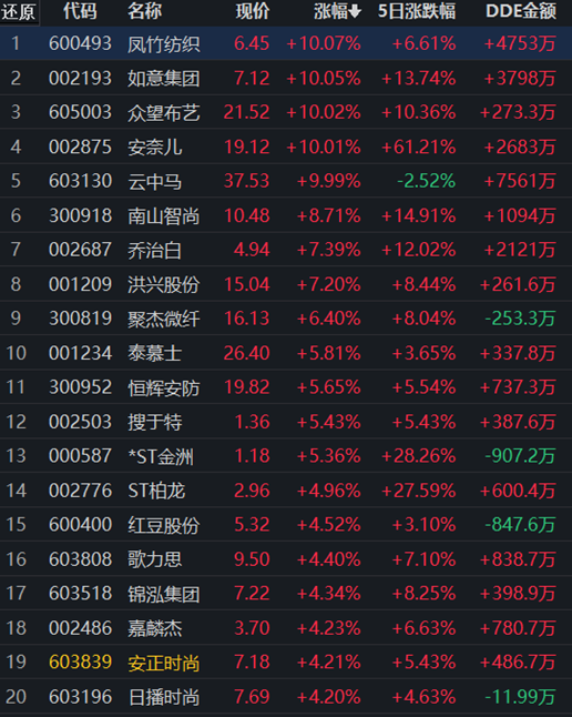 12月2日,申萬一級(jí)行業(yè)中紡織服飾行業(yè)領(lǐng)漲,漲幅達(dá)1.76%,獲得5858萬元大單資金的凈流入,居資金流入行業(yè)第5位。行業(yè)中113只交易中的個(gè)股,有102只上漲,其中,13只個(gè)股漲幅超5%。
