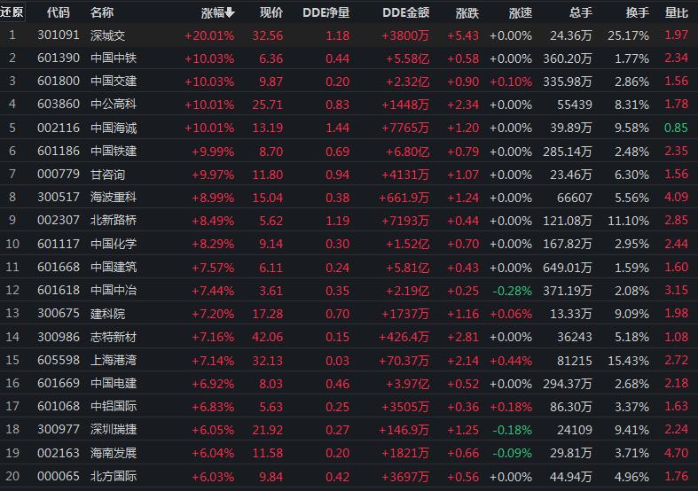 12月5日,建筑裝飾行業(yè)漲幅居首,達4.76%。其中,中國海誠、中國交建、甘咨詢、中國鐵建、中國中鐵、中公高科、深城交等7只概念股集體漲停。