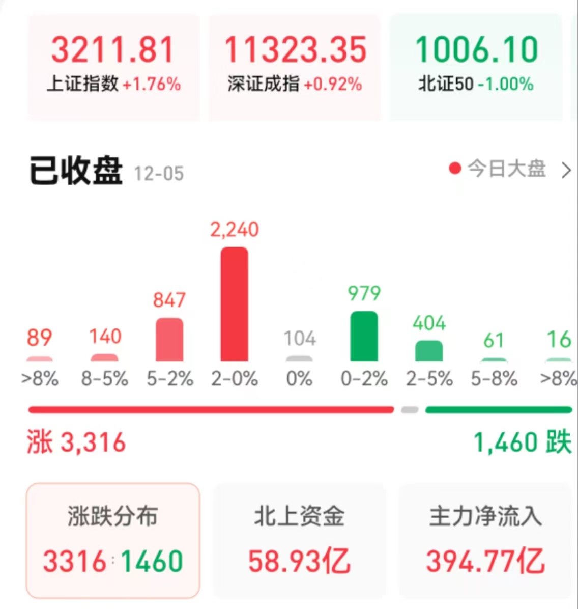 周一(12月5日),A股三大指數(shù)震蕩分化。截至收盤,上證指數(shù)漲1.76%報3211.81點,深證成指漲0.92%報11323.35點,創(chuàng)業(yè)板指跌0.26%報2377.11點;滬深兩市合計成交額突破萬億元,達10551億元。北向資金凈買入58.93億元。總體來看,兩市個股漲多跌少。