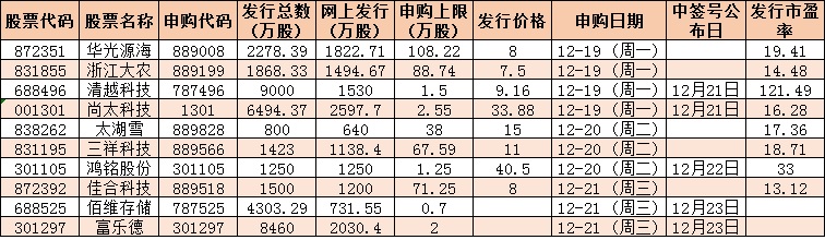 根據(jù)發(fā)行安排,下周(12月19日-23日)有10只新股發(fā)行,周一安排4只,周二和周三分別有3只。周一分別為,尚太科技、華光源海、浙江大農(nóng)、清越科技;周二為,太湖雪、三祥科技、鴻銘股份;周三為,佳合科技、佰維存儲、富樂德。
