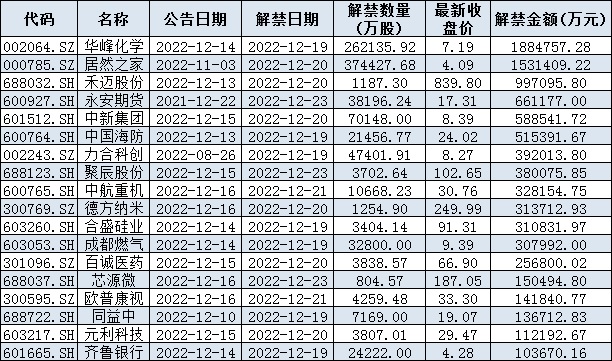 與此同時,統(tǒng)計顯示,下周(12月19日-23日)共有82家公司合計96.6億股限售股陸續(xù)解禁。按最新收盤價計算,解禁市值為1176.32億元。從解禁市值來看,華峰化學(188.48億元)、悅心健康(153.14億元)等公司解禁金額均超150億元。