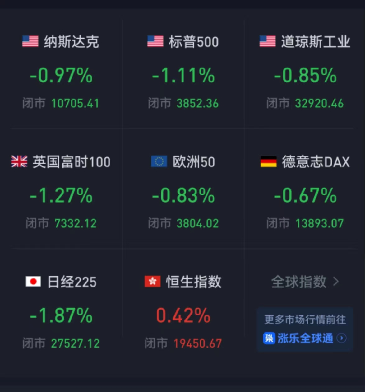 周五,美國三大股指全線收跌,道指跌0.85%報32920.46點,標普500指數(shù)跌1.11%報3852.36點,納指跌0.97%報10705.41點。本周,道指跌1.66%,標普500指數(shù)跌2.08%,納指跌2.72%。