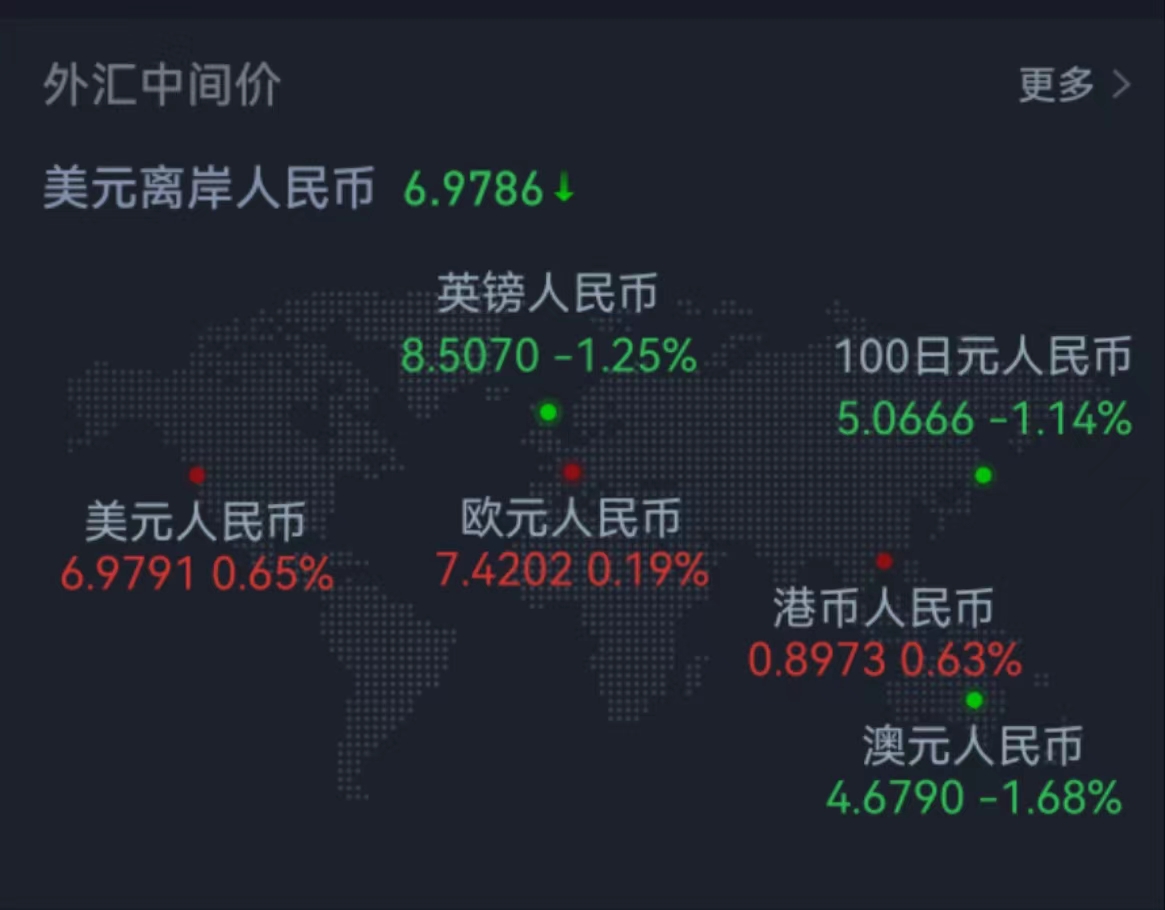 周五在岸人民幣兌美元16:30收盤報6.9716,較上一交易日下跌26個基點,本周累計下跌236個基點,夜盤23:30收報6.9750。人民幣兌美元中間價報6.9791,調(diào)貶448個基點,調(diào)貶幅度為5月27日以來最大,本周累計調(diào)貶203個基點。