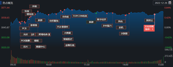 12月26日,A股三大指數(shù)高開高走,滬指開盤收復(fù)5日均線,距60日均線僅一步之遙。截至收盤,上證指數(shù)漲0.65%報3065.56點;深證成指漲1.19%報10978.99點,創(chuàng)業(yè)板指漲1.98%報2331.41點,A股合計成交額6246.01億元??傮w上看,A股個股漲多跌少,有3729只上漲,1171只下跌。