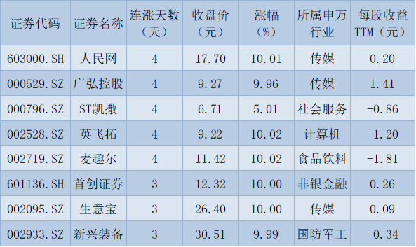 表:連續(xù)上漲3日且今日收盤漲停股一覽
