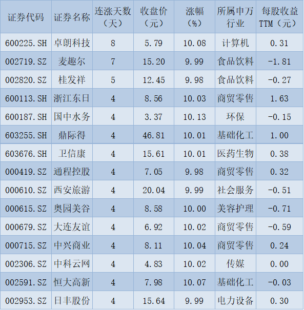 表:連續(xù)上漲4日且今日收盤漲停股一覽