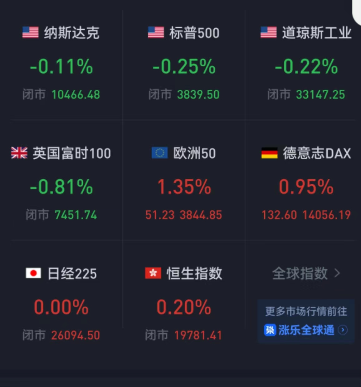 上周五,歐股收盤全線下跌,德國DAX指數(shù)跌1.05%報13923.59點,全年累跌12.35%;法國CAC40指數(shù)跌1.52%報6473.76點,全年累跌9.5%;英國富時100指數(shù)跌0.81%報7451.74點,全年累漲0.91%。