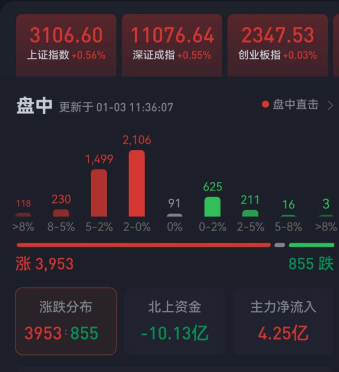 周二(1月3日),三大股指繼續(xù)震蕩走強(qiáng),全線飄紅。截至上午收盤,上證指數(shù)漲幅達(dá)0.56%,報3106.60點;深證成指和創(chuàng)業(yè)板指漲幅分別為0.55%和0.03%;滬深兩市合計成交額4672.2億元,總體來看,兩市個股漲多跌少,上漲個股近4000只,其中,漲停個股達(dá)79只,跌停個股達(dá)3只。