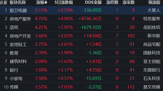 從早盤表現(xiàn)強(qiáng)勢的廚衛(wèi)電器行業(yè)看,交易中的9只成份股全線上漲,其中4只漲幅超5%。資金流向看,廚衛(wèi)電器行業(yè)大單資金凈流入額為-336.69萬元,居行業(yè)第28位,排名第一的房地產(chǎn)開發(fā)行業(yè),大單資金凈流入額為14.69億元。