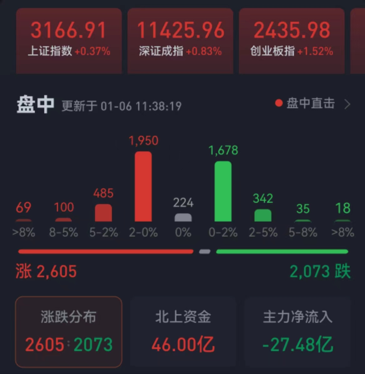 周五(1月6日),三大股指繼續(xù)震蕩走強(qiáng),全線飄紅。截至上午收盤,上證指數(shù)漲幅達(dá)0.37%,報(bào)3166.91點(diǎn);深證成指和創(chuàng)業(yè)板指漲幅分別為0.83%和1.52%;滬深兩市合計(jì)成交額5220.8億元,總體來(lái)看,兩市個(gè)股漲多跌少,上漲個(gè)股近超2600只,其中,漲停個(gè)股達(dá)40只,跌停個(gè)股達(dá)8只。