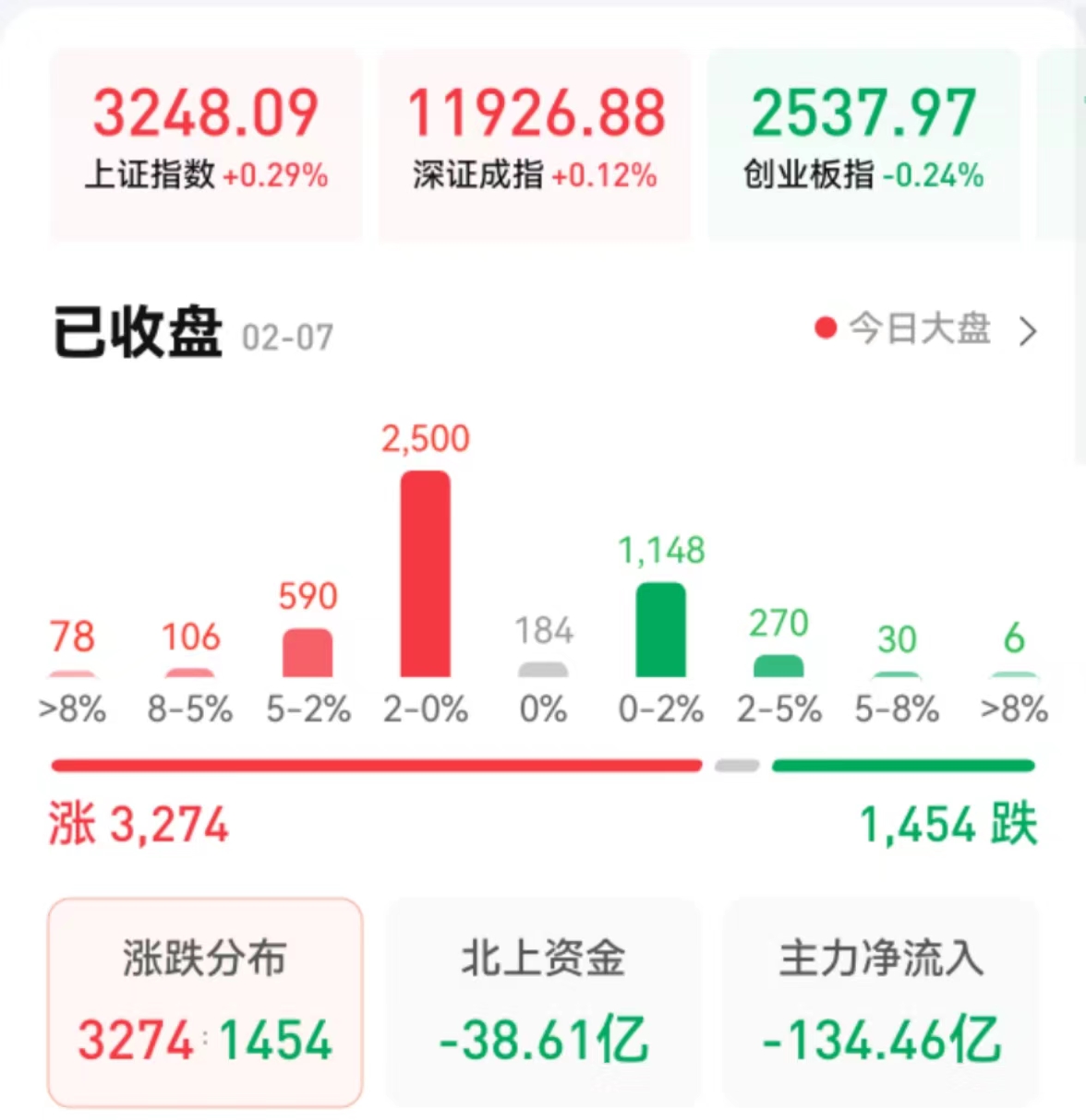 周二(2月7日),A股三大股指震蕩分化,漲跌不一。截至收盤,上證指數(shù)漲0.29%,報3248.09點;深證成指漲0.12%,報11926.88點;創(chuàng)業(yè)板指跌0.24%,報2537.97點。兩市合計成交金額達8457億元,北向資金凈賣出38.61億元??傮w上看,兩市個股漲多跌少。近3300只個股實現(xiàn)上漲,其中,漲停個股達48只,跌停個股達9只。