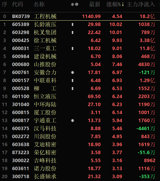 從早盤表現(xiàn)相對強勢的工程機械行業(yè)看,交易中的33只成份股有31只上漲,其中,3只個股封漲停板,另外,11只個股漲超5%。資金方面,有18.2億元大單資金凈流入工程機械行業(yè)。