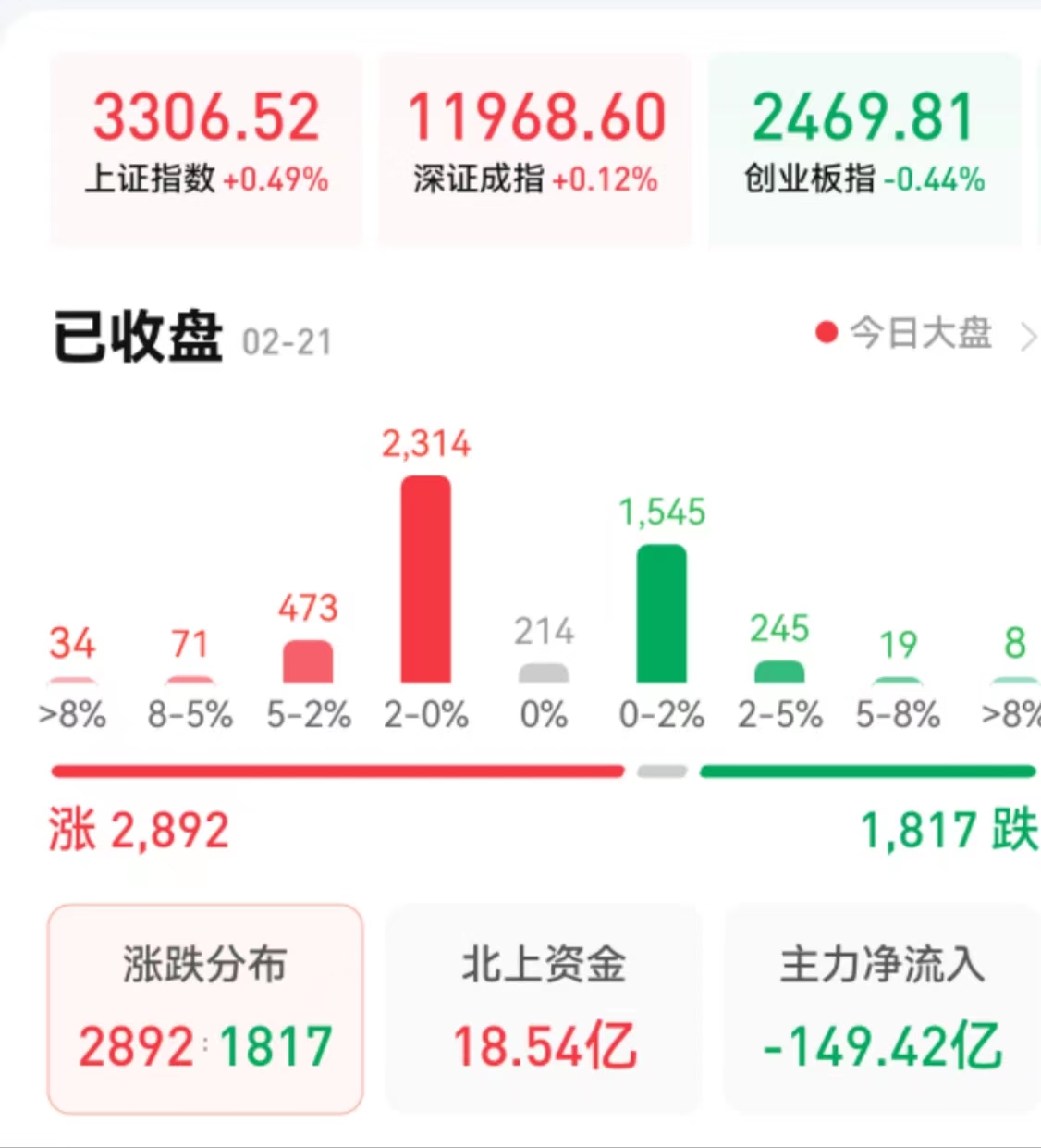 周二(2月21日),A股三大指數(shù)震蕩分化。截至收盤,上證指數(shù)漲0.49%報(bào)3306.52點(diǎn),深證成指漲0.12%報(bào)11968.6點(diǎn),創(chuàng)業(yè)板指跌0.44%報(bào)2469.81點(diǎn);兩市合計(jì)成交9214億元,北向資金凈買入18.54億元。總體上看,兩市個(gè)股漲多跌少。其中,漲停個(gè)股達(dá)20只,跌停個(gè)股達(dá)5只。