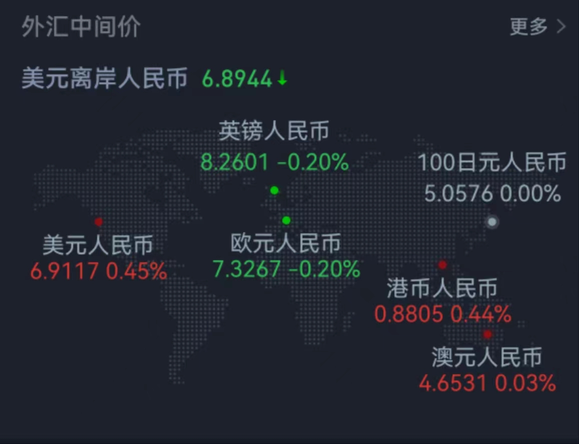 周五在岸人民幣兌美元16:30收盤報6.9002,較上一交易日上漲84個基點。當日人民幣兌美元中間價報6.9117,調(diào)貶309個基點,本周累計調(diào)貶175個基點。在岸人民幣兌美元夜盤收報6.9015。