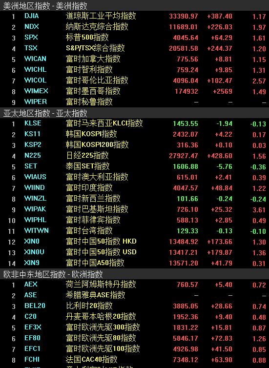 周五,美國三大股指全線收漲,道指漲1.17%報33390.97點,標普500指數(shù)漲1.61%報4045.64點,納指漲1.97%報11689.01點。本周,道指漲幅達1.75%,標普500指數(shù)漲幅達1.9%,納指漲幅達2.58%。