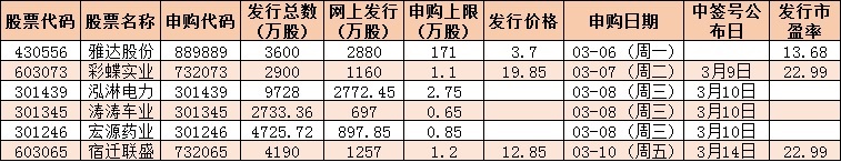 根據(jù)發(fā)行安排,下周(3月6日-10日)有6只新股發(fā)行,其中滬市主板有2只,創(chuàng)業(yè)板有3只,北交所1只。具體安排如下,周一1只:雅達股份(北交所);周二1只:彩蝶實業(yè);周三3只:泓淋電力(創(chuàng)業(yè)板)、濤濤車業(yè)(創(chuàng)業(yè)板)、宏源藥業(yè)(創(chuàng)業(yè)板);周五1只:宿遷聯(lián)盛。