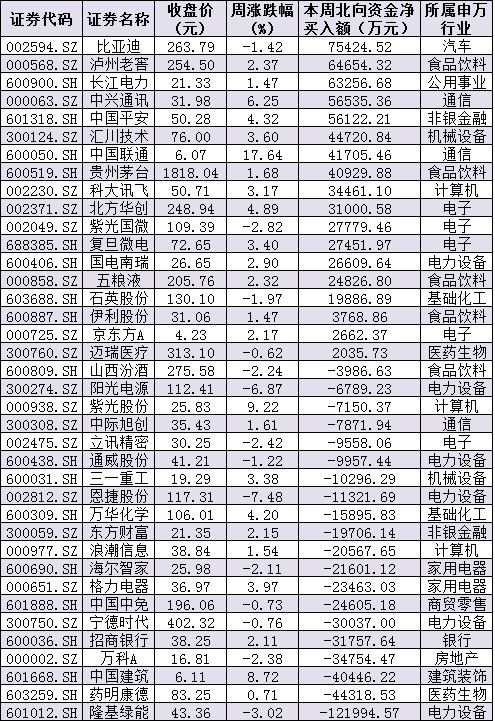 資金方面,北向資金累計凈買入金額達66.19億元。從前十大成交活躍股來看,比亞迪、瀘州老窖、長江電力、中興通訊、中國平安等5只個股,北向資金凈買入金額均超5億元。另外,隆基綠能、藥明康德、中國建筑等個股遭北向資金凈賣出金額均超4億元。