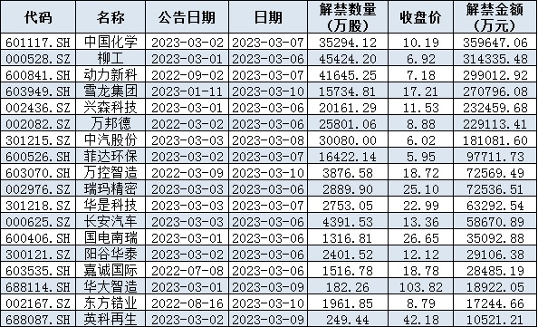 與此同時,統(tǒng)計顯示,下周(3月6日-10日)共有50家公司限售股陸續(xù)解禁,按最新收盤價計算,解禁市值為251.18億元。從解禁市值來看,中國化學(35.96億元)、柳工(31.43億元)等公司解禁金額均超30億元。