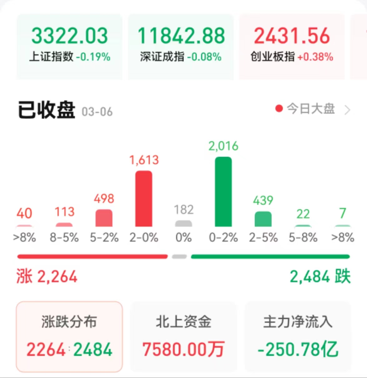周一(3月6日),A股三大指數(shù)震蕩整理,漲跌不一。截至收盤,上證指數(shù)跌0.19%報(bào)3322.03點(diǎn),深證成指微跌0.08%報(bào)11842.88點(diǎn),創(chuàng)業(yè)板指漲0.38%報(bào)2431.56點(diǎn);兩市合計(jì)成交9509億元,北向資金凈買入7580萬元??傮w上看,兩市個(gè)股跌多漲少。其中,漲停個(gè)股達(dá)31只,跌停個(gè)股2只。