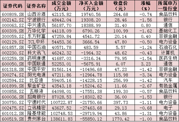 表:今日滬、深股通前十大成交活躍股交易情況: