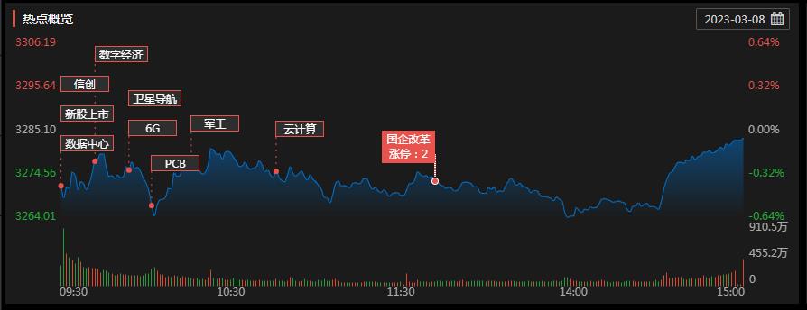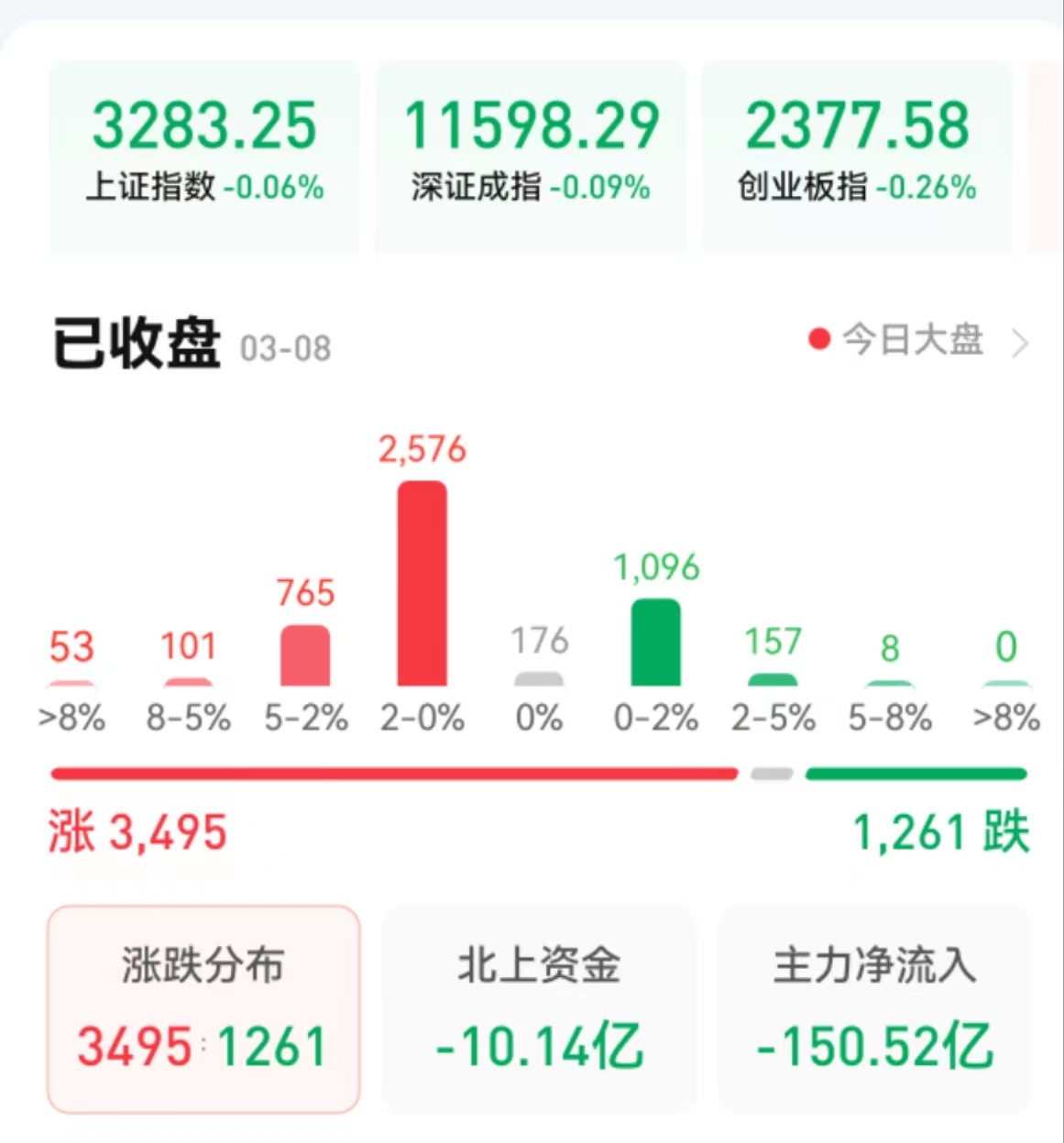 周三(3月8日),A股三大指數(shù)震蕩整理,小幅回落。截至收盤(pán),上證指數(shù)微跌0.06%報(bào)3283.25點(diǎn),深證成指跌0.09%報(bào)11598.29點(diǎn),創(chuàng)業(yè)板指跌0.26%報(bào)2377.58點(diǎn);兩市合計(jì)成交金額達(dá)7185億元,北向資金凈賣(mài)出10.14億元??傮w上看,兩市個(gè)股漲多跌少。其中,漲停個(gè)股達(dá)40只,沒(méi)有跌停個(gè)股。