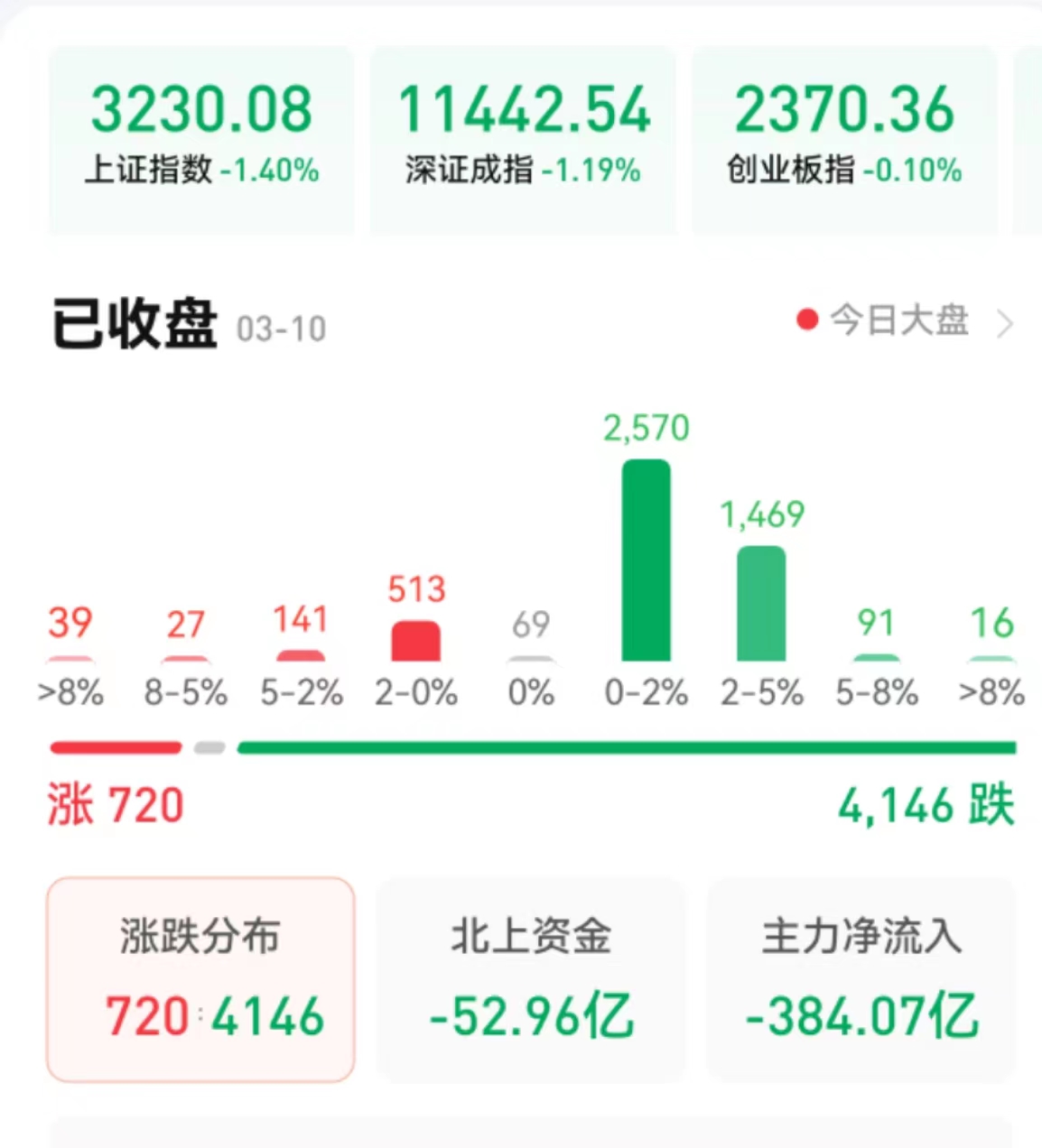 周五(3月10日),A股三大指數(shù)震蕩下行。截至收盤(pán),上證指數(shù)跌1.4%報(bào)3230.07點(diǎn),深證成指跌1.19%報(bào)11442.54點(diǎn),創(chuàng)業(yè)板指跌0.1%報(bào)2370.36點(diǎn);兩市合計(jì)成交金額達(dá)8096億元,北向資金凈賣出52.96億元??傮w上看,兩市個(gè)股跌多漲少,超4100只個(gè)股出現(xiàn)下跌。