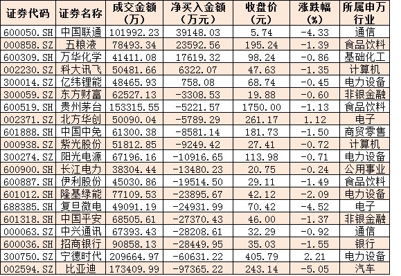 表:今日滬、深股通前十大成交活躍股交易情況: