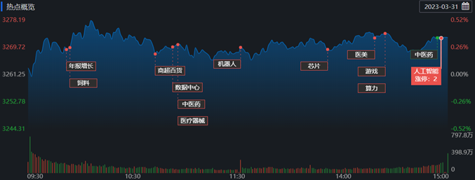 投資策略方面,壁虎資本研究員楊奕潔表示,今天是第一季度最后一個交易日,回顧第一季度從1月份的北向資金大幅涌入,藍籌股大幅走強,到2、3月份市場從ChatGPT延伸到AI,總體來說行情趨勢圍繞大科技板塊為主。本周市場主流還是圍繞AI、數字經濟、和年報高于預期等標的為主。在美聯儲加息進入尾聲、國內經濟復蘇、國產替代自主可控的前提下,預計進入4月份市場主流還是圍繞大科技為主。楊奕潔對中長期內結構性機會保持樂觀態(tài)度,具體投資方向可以關注,人工智能、數字經濟、半導體、軍工、消費等行業(yè)的投資機會。