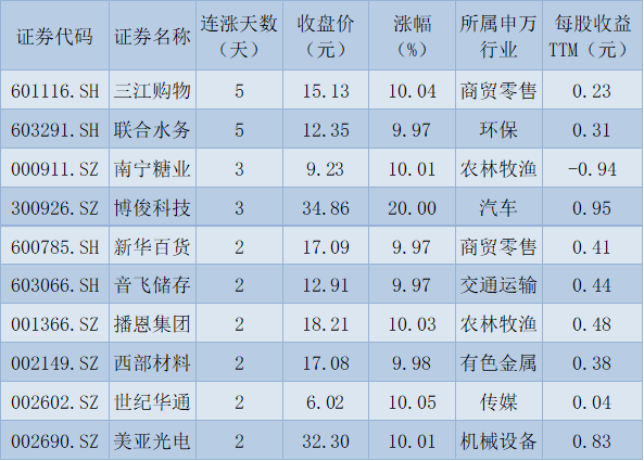 表:連續(xù)上漲2日且今日收盤漲停股一覽