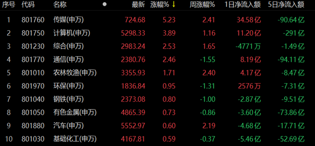3月31日,行業(yè)漲多跌少,從31類申萬一級行業(yè)看,有26類行業(yè)上漲,占比83.87%,傳媒漲幅居首,達5.23%;此外,計算機、綜合和通信等3行業(yè)漲幅均超2%。5類下跌行業(yè)中,家用電器領跌,跌幅為1.23%。